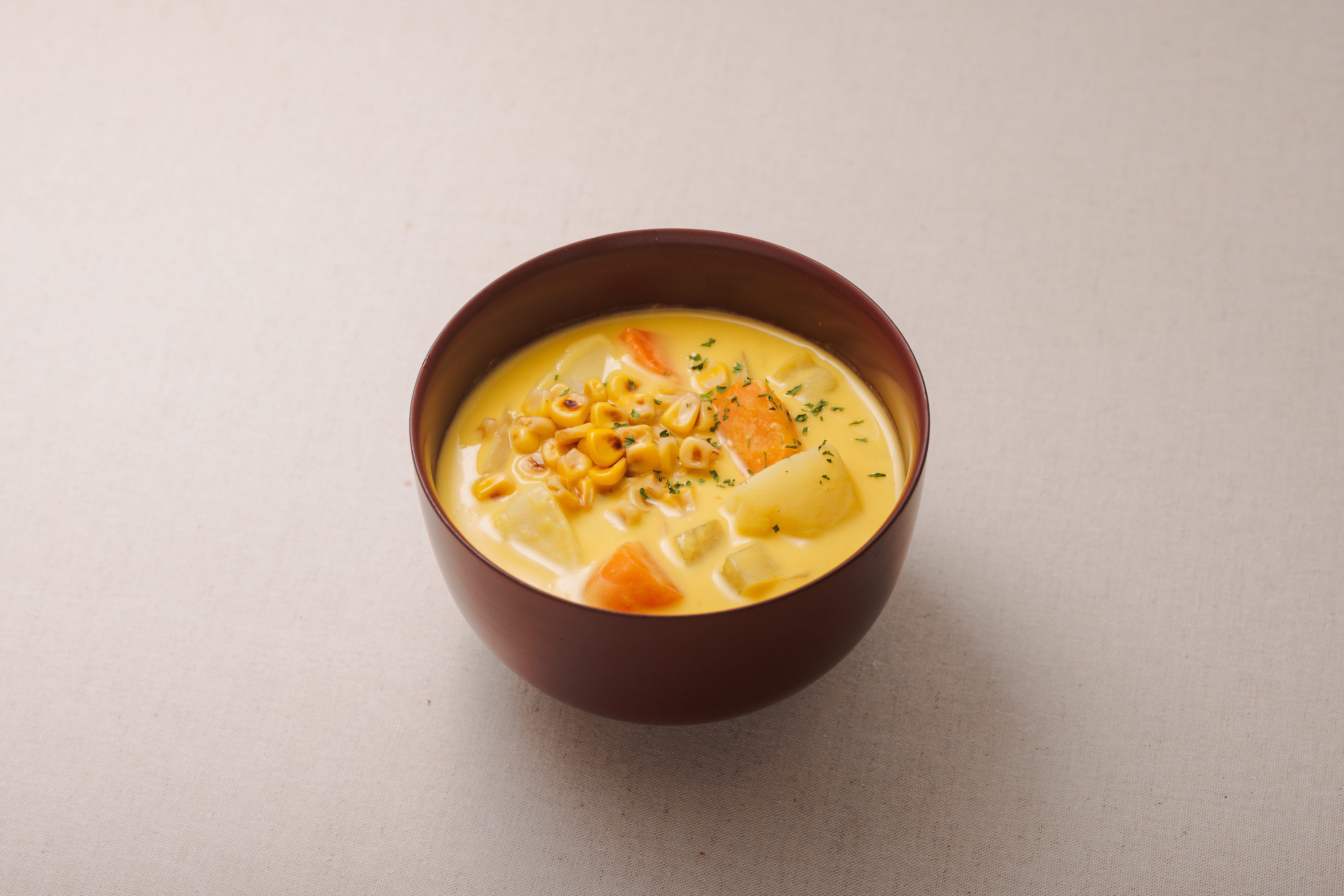 じゃがいもやにんじん等ごろっとした具がたくさん入っており、食感も楽しめる一品です。とうもろこしは一度焼いてから入れているので、香ばしく甘みたっぷりに仕上がっております。豆乳を使用し、だしを効かせているのであっさりと召し上がれます。和と洋が織りなす美味しさをご堪能下さい。