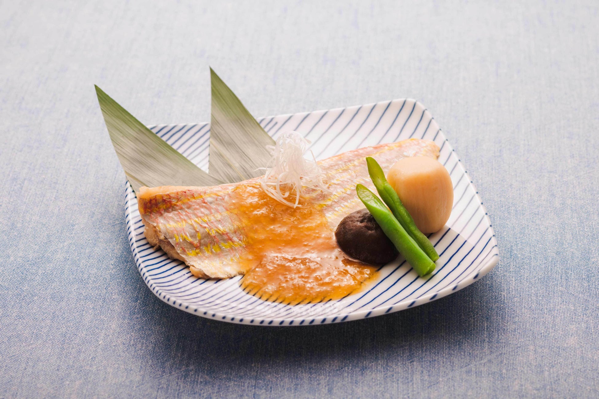 ほんのりとした甘みが特徴のイトヨリダイを本枯鰹節で煮て、だしの効いたおろしぽん酢の餡をかけました。だし餡にぽん酢を使用し、食欲が落ちやすくなる暑い夏でもさっぱりといただけるようこだわりました。本枯鰹節で煮たイトヨリダイのだし感もぜひお楽しみ下さい。
