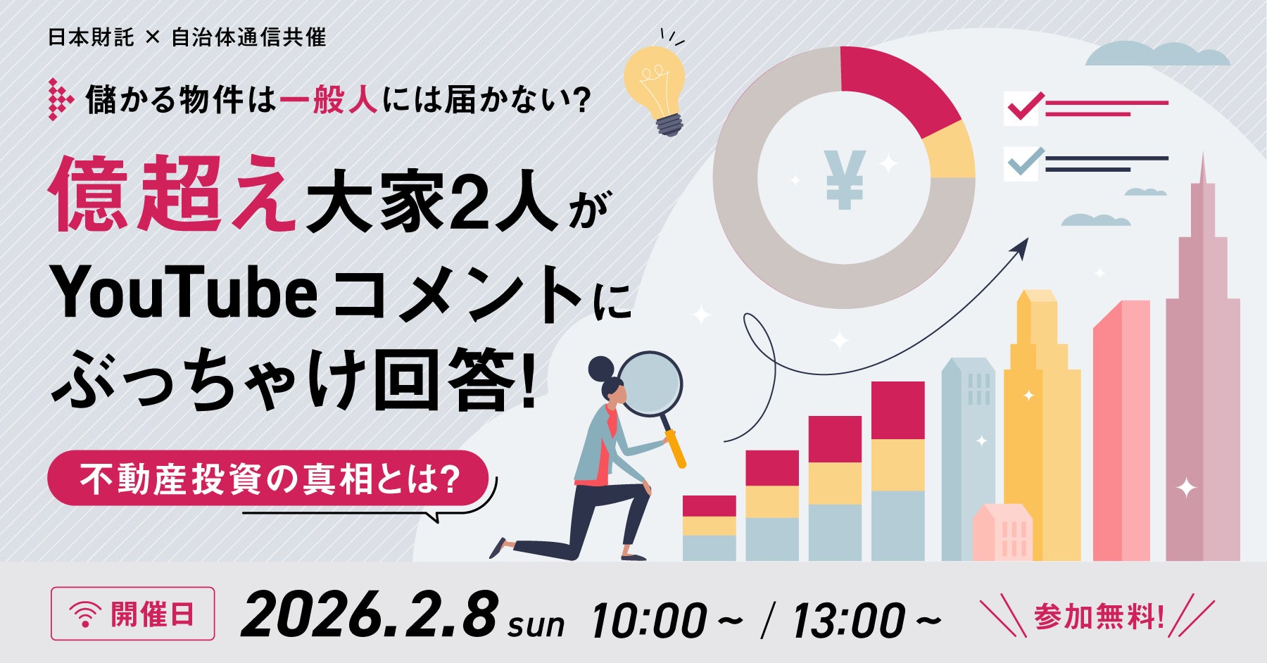 イシン株式会社(本社:東京都港区、代表取締役社長:西中 大史、証券コード:143A)が運営する公民共創の先進事例を紹介するメディア『自治体通信』は、2026年2月8日(日)に日本財託×自治体通信共催セミナー「【年収500万円以上の公務員にオススメ!】儲かる投資物件は一般人には届かない?億超え大家2人がYouTubeコメントにぶっちゃけ回答!不動産投資の真相とは?」を開催いたします。