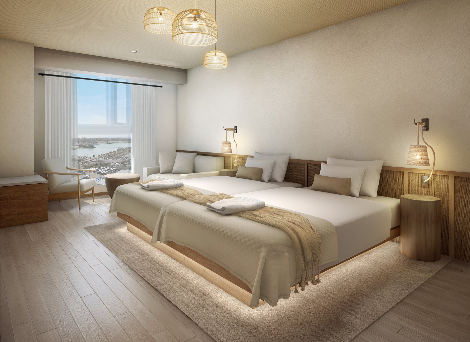 ナチュラルウッドと白を基調とした明るくリゾートを感じられるくつろぎの空間。モダレットルームやツインベッドルーム、トリプルベッドルーム等、利用スタイルに応じて様々なタイプの客室をご用意。