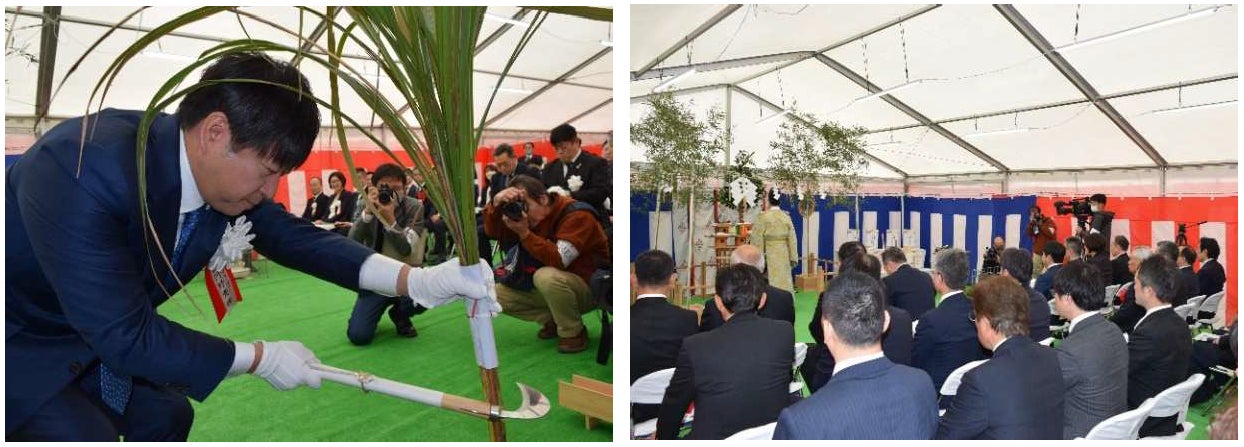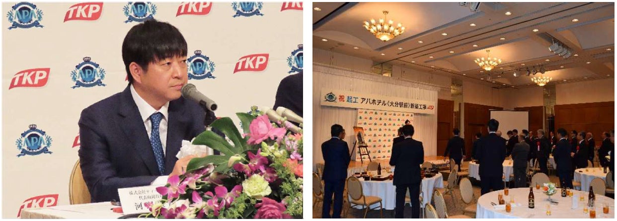 起工式には、アパグループ 社長兼CEO 元谷一志氏をはじめ、大分交通株式会社 代表取締役会長 杉原正晴氏、平倉建設株式会社 代表取締役会長 平倉二三雄氏等、関係者約30名が参列し、「地鎮の儀」等の神事で工事の安全や無事完成を祈願しました。