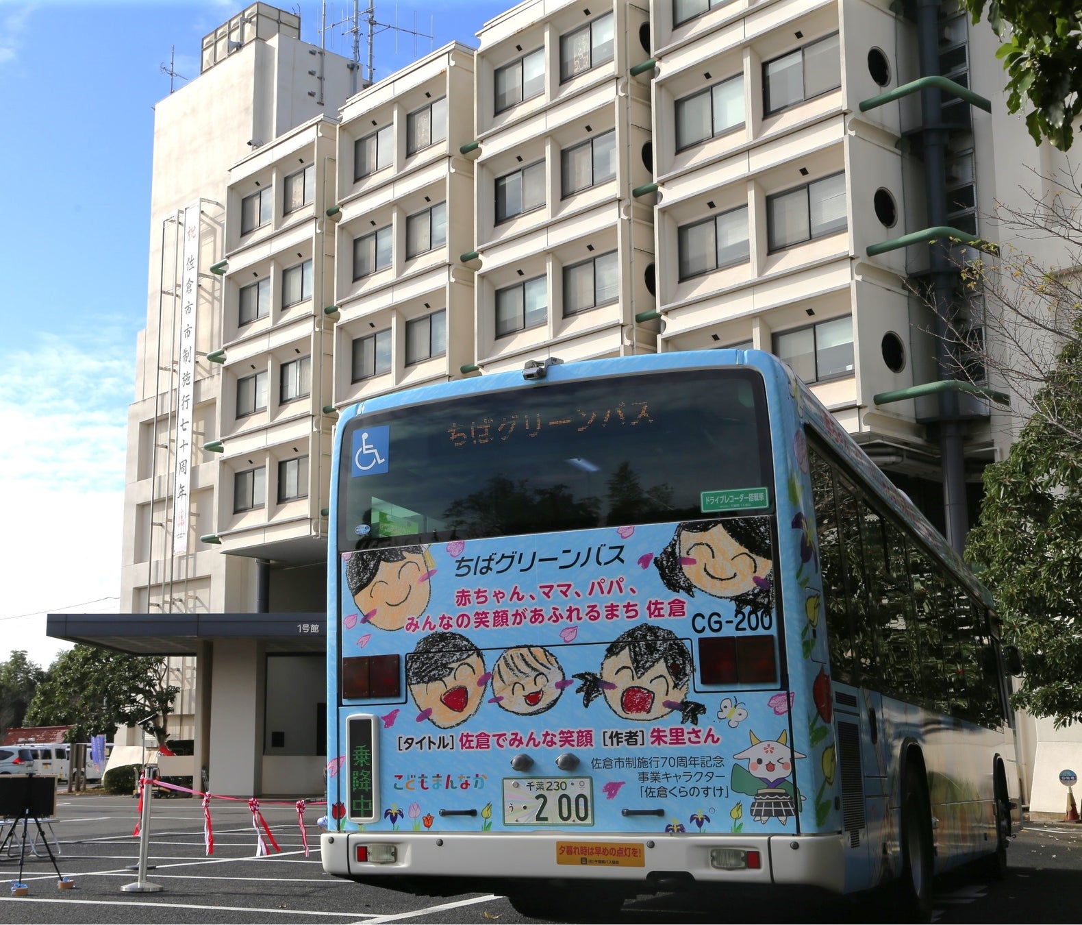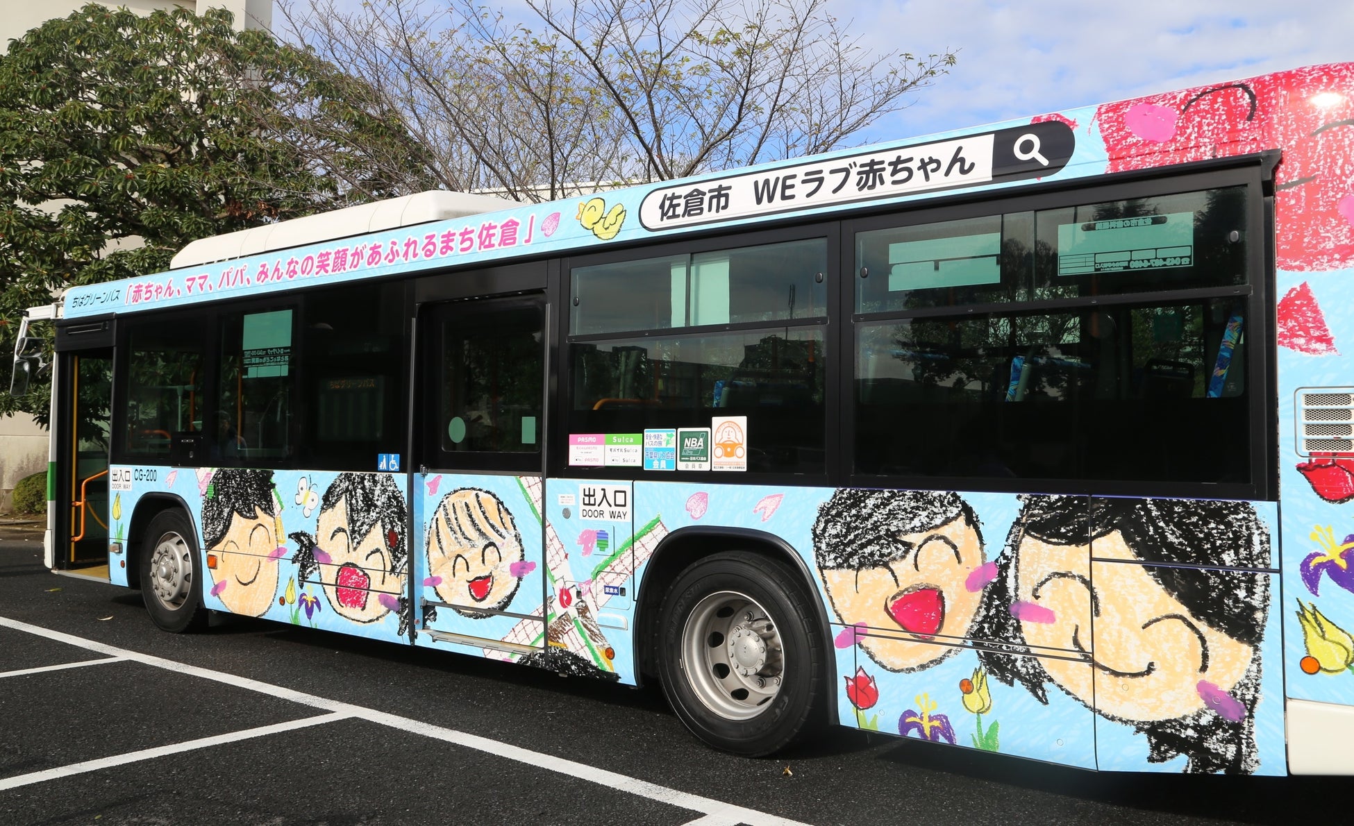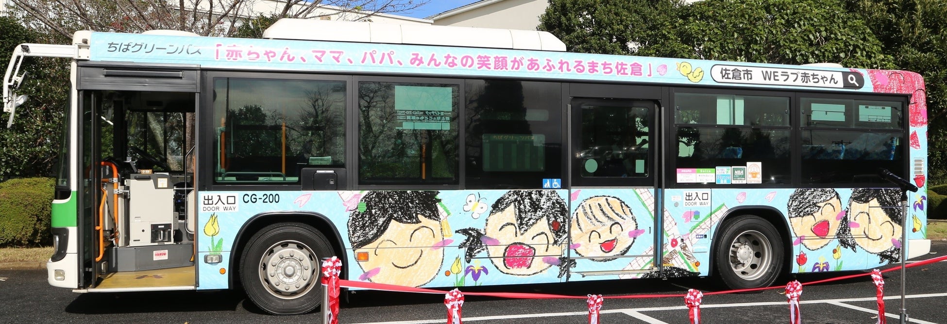 市内の小学生までを対象に「赤ちゃん、ママ、パパ、みんなの笑顔があふれるまち、佐倉」をテーマにイラストの募集を行い、集まった53作品の中から選ばれた1作品を市内路線バスにフルラッピングを行った「子育て応援バス」の運行を開始しました。