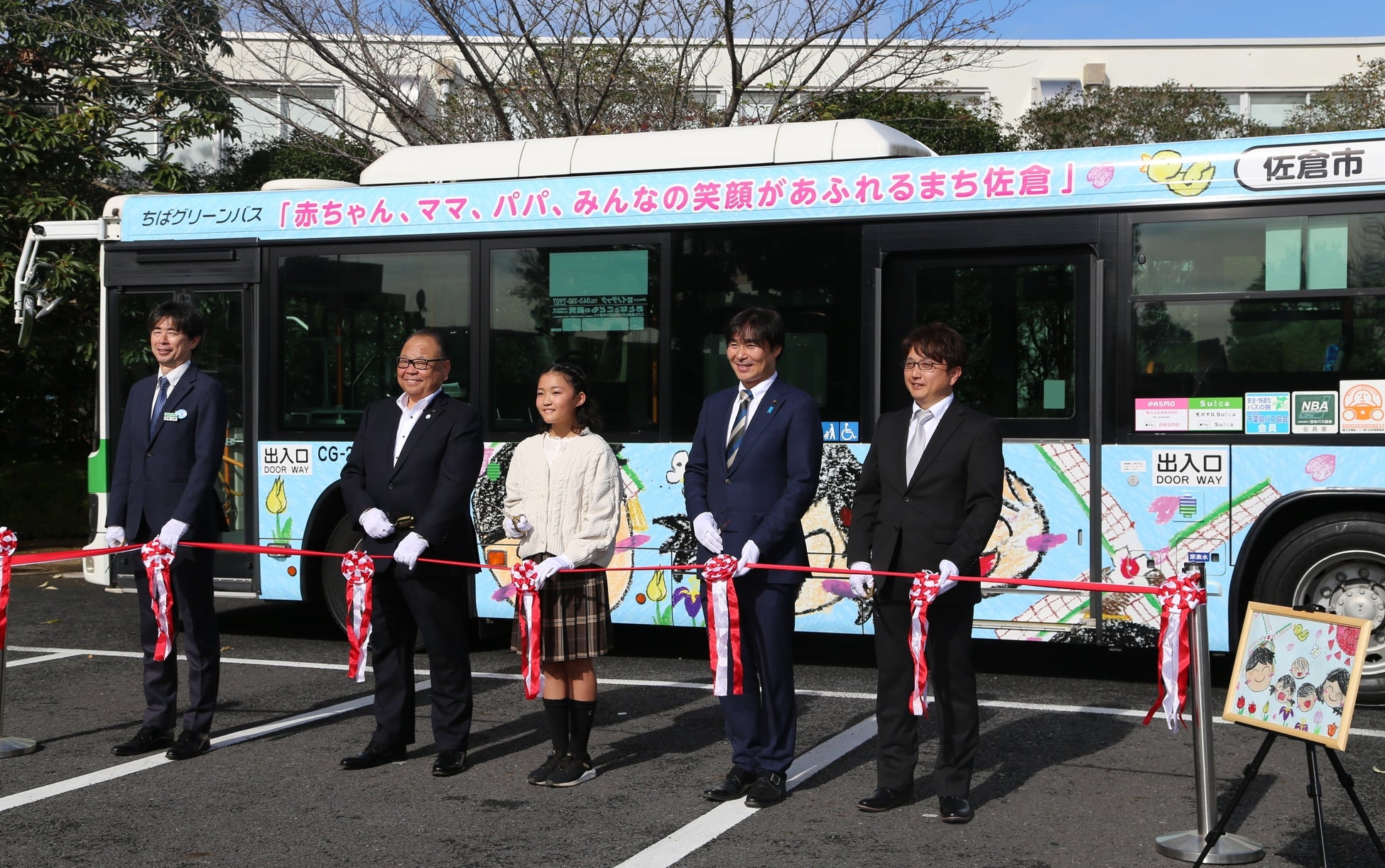 ちばグリーンバス㈱代表取締役社長 渡邉友樹、佐倉市長 西田三十五、朱里さん、佐倉市議会副議長 密本成章、ビズクルー㈱代表取締役 田中良平
