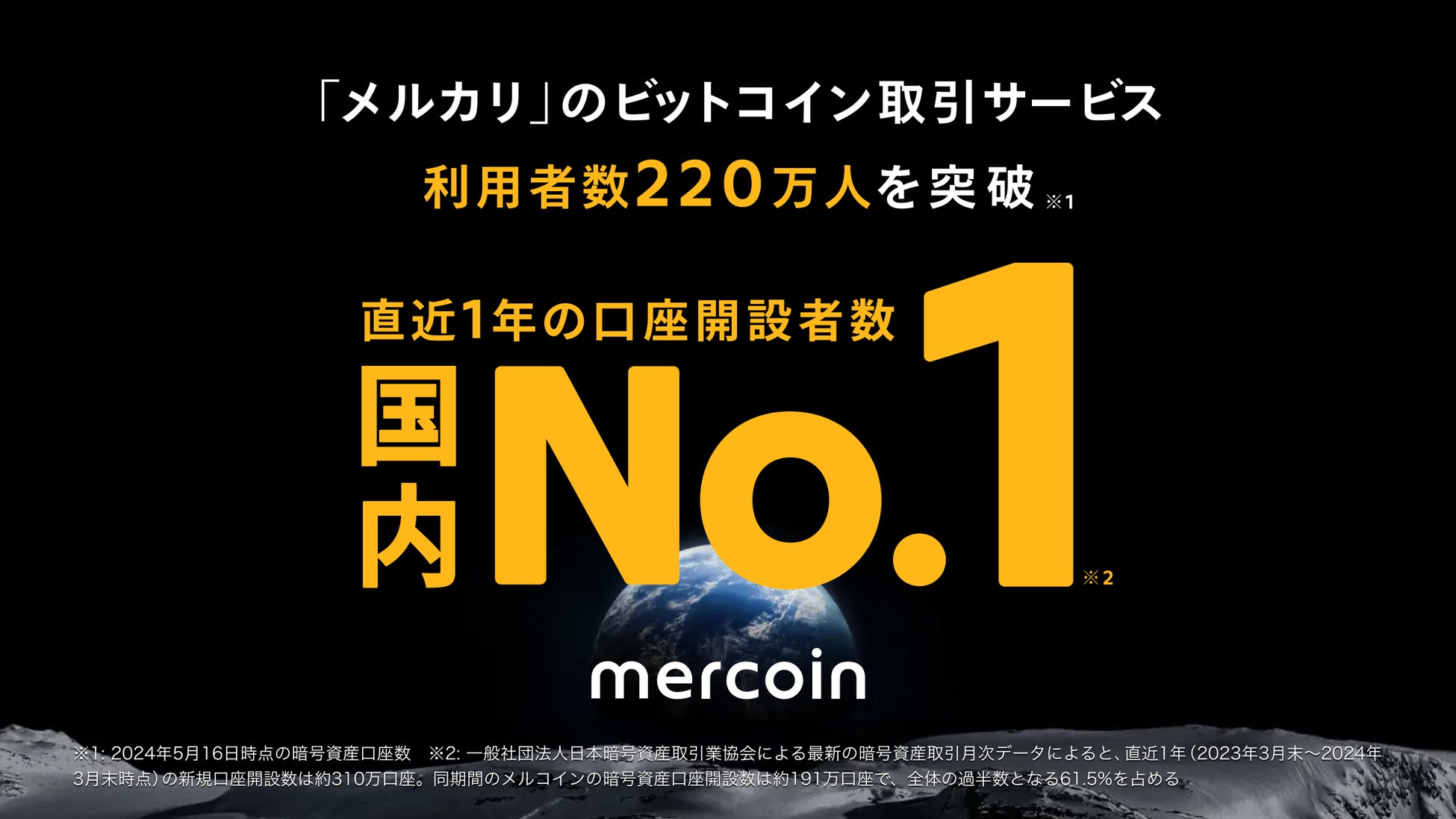 株式会社メルカリ(以下、メルカリ)の子会社で、メルカリグループにおけるブロックチェーンサービスの提供・開発を行う株式会社メルコイン(以下、メルコイン)が提供する、ビットコイン取引サービスの暗号資産口座数は220万口座(※1)を超え、直近1年(2023年4月1日〜2024年3月31日の1年間)の暗号資産口座開設数が業界No.1(※2)となったことをお知らせいたします。