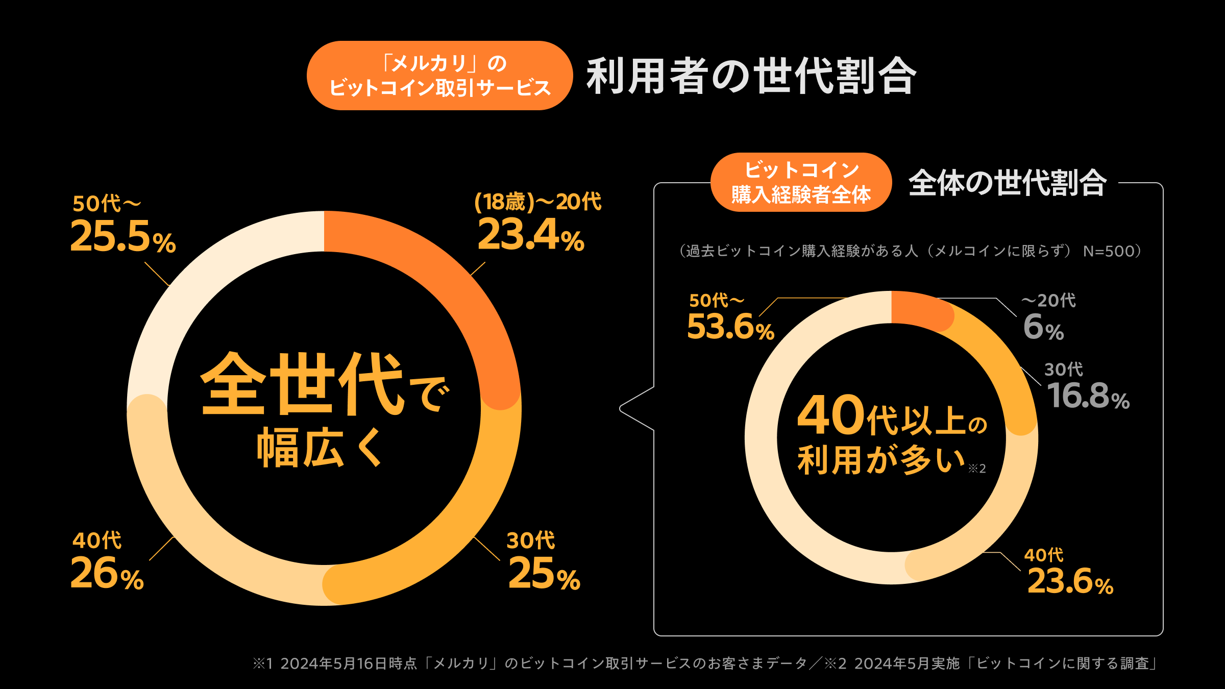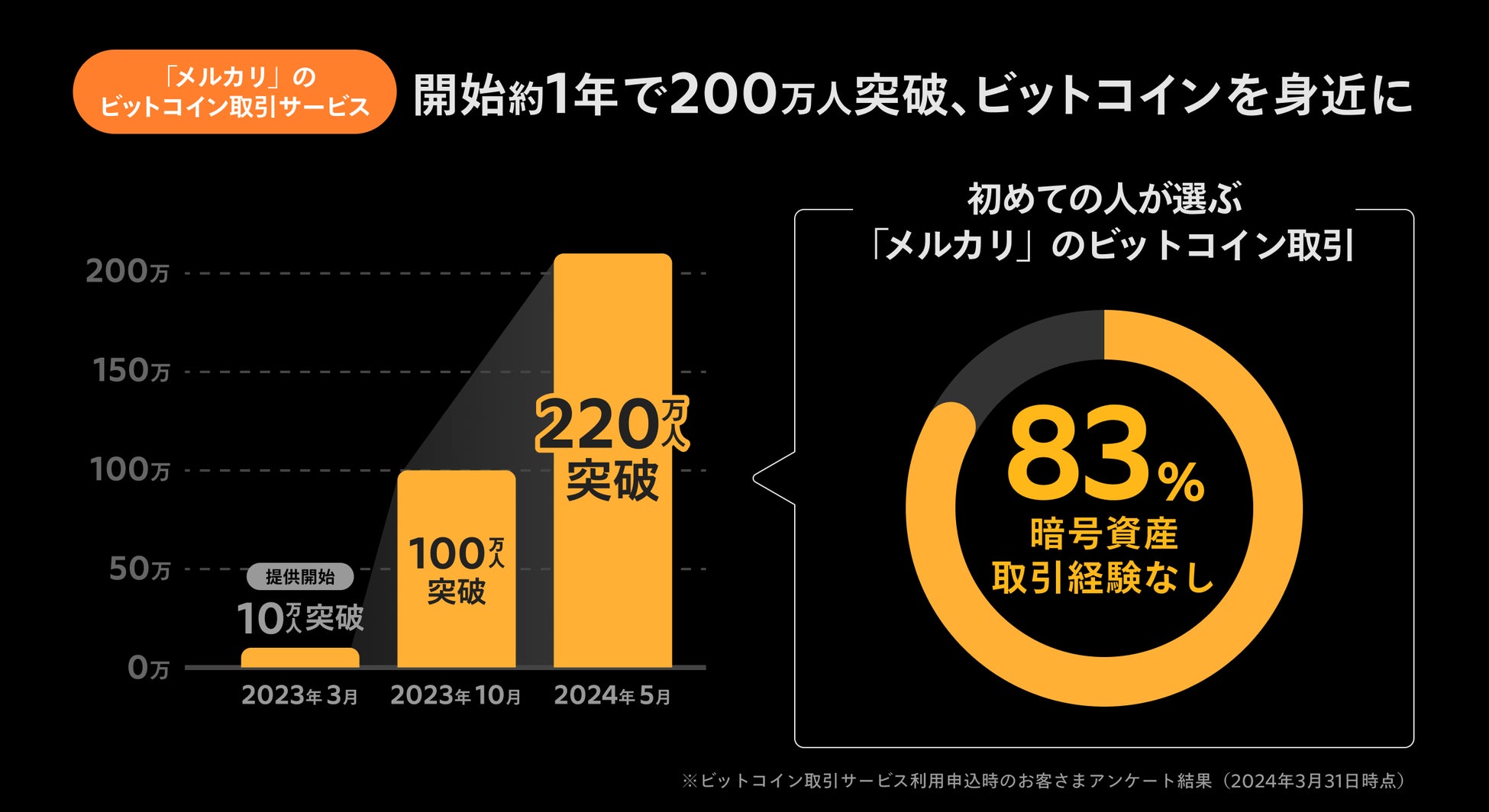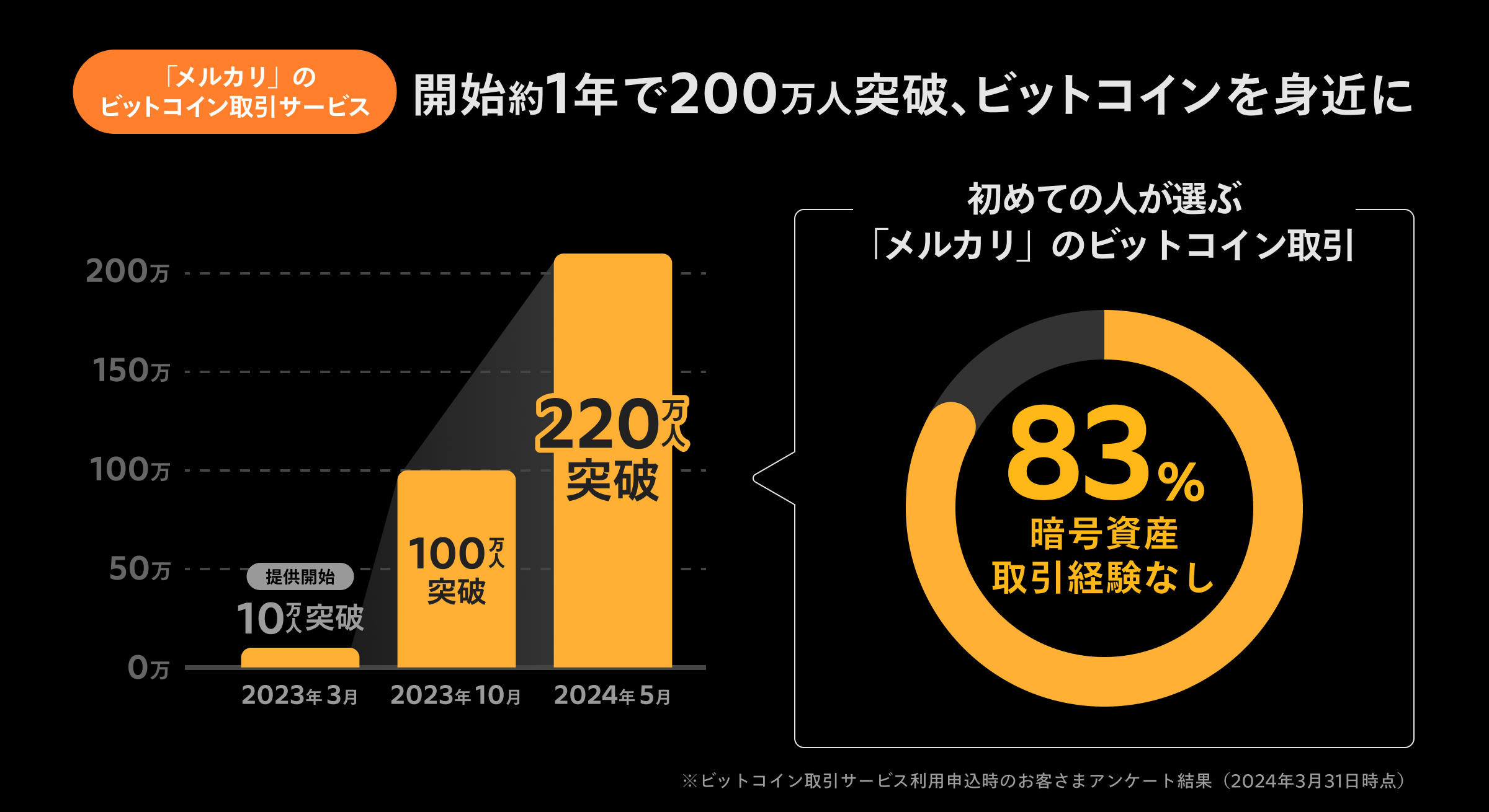 ご利用いただいてるお客さまの83%は暗号資産取引が初めてで、これまでの暗号資産利用者層のイメージとは異なるお客さまを中心に「メルカリ」のビットコイン取引サービスは拡大を続けています。