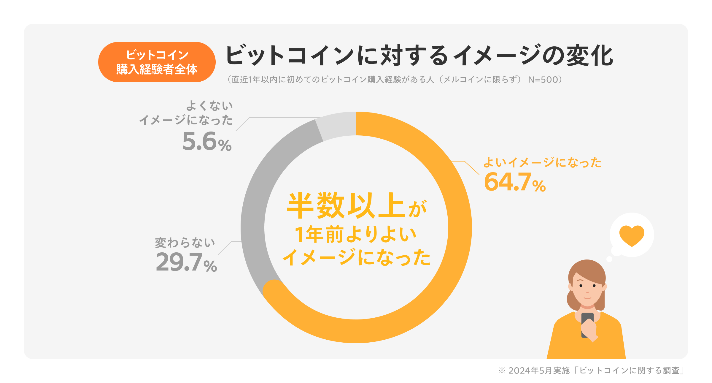 また、直近1年でビットコインを初めて購入した人は、ETF承認や半減期後の価格上昇期待によって取引が活況となったことに加え、ビットコインに対する意識の変化が生まれていることも明らかとなりました。元々はネガティブなイメージを持たれることもあったビットコインですが、直近1年のイメージ変化を伺うと、ポジティブなイメージに変わったと64.7%が回答しました。理由としては、「思ったよりもかんたんだったから」「少額で始められたから」の回答が多く、ハードルが低かったと感じる人が多い結果となりました。
