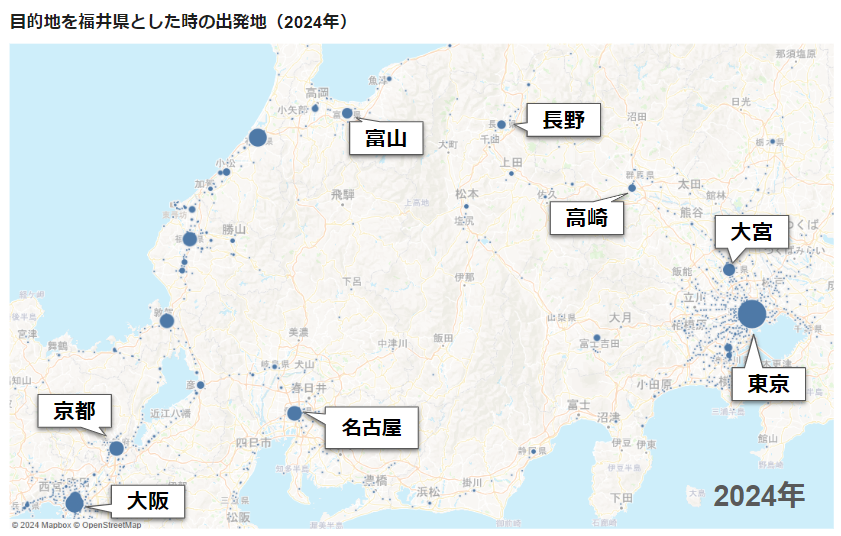 延伸前後(延伸前2023年3月18日(土)~2023年3月31日(金)/延伸後2024年3月16日(土)~2024年3月29日(金))での、福井県を目的地とした出発地を確認したところ、東日本では富山、長野、高崎、大宮、東京駅と「北陸新幹線」の停車駅を出発地とした検索が増加し、西日本では大阪、京都、名古屋駅と福井県に向けて特急列車の始発駅を出発地とした検索が増加していることが確認できました。延伸後の駅を活用した移動需要が多く見込まれることが示唆されます。
