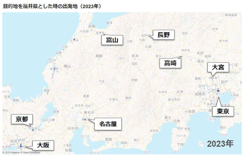 調査対象期間をもとに、公共交通機関を用いたルート検索で目的地として検索された駅を集計したところ、2023年の検索数との比較では「北陸新幹線」の停車駅である敦賀駅が8.35倍、福井駅が3.61倍、芦原温泉駅、小松駅も2倍を超える結果となりました。また新幹線停車駅ではありませんが鯖江駅が2.38倍、小浜駅が2.18倍の結果となっており、以上の結果から、「北陸新幹線」の開業により沿線エリアだけでなく、県内他エリアへの来訪も予測され、経済波及効果も期待されます。