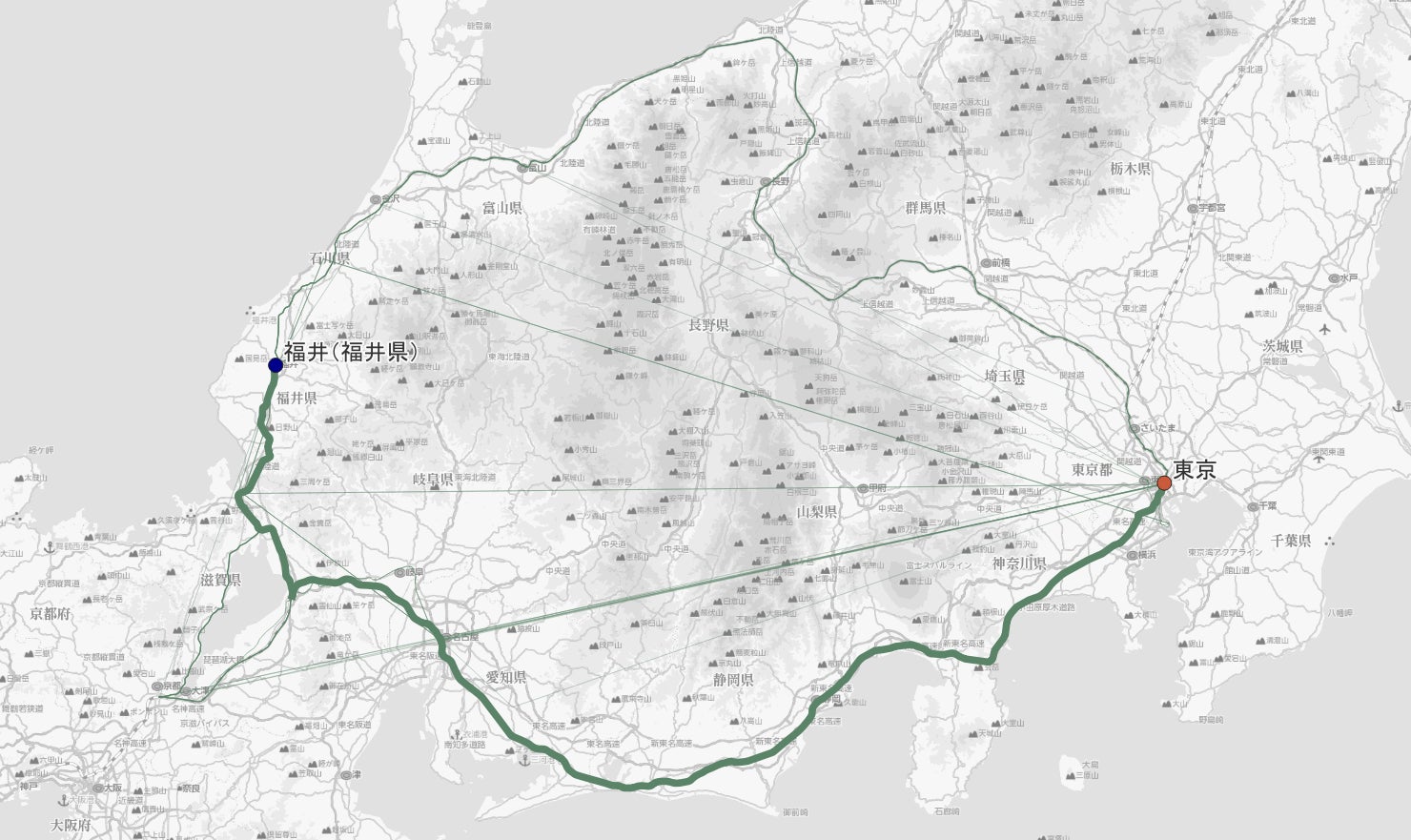 延伸前、東京駅-福井駅間の経路検索における傾向
