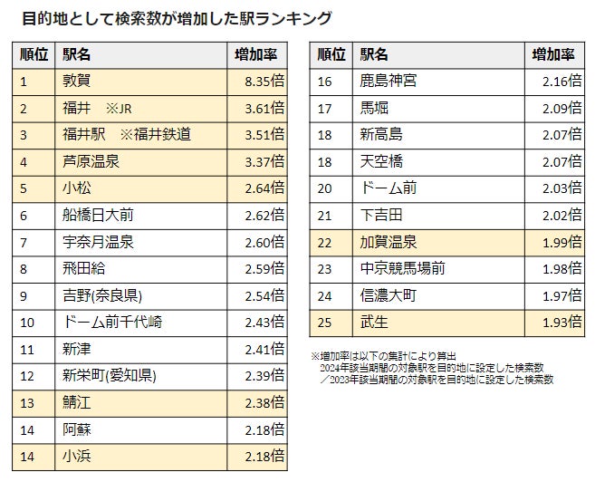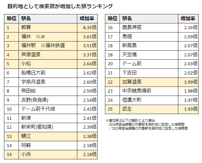 東京から福井へ向かう経路が北回りへ変化、沿線駅の検索数も増加傾向