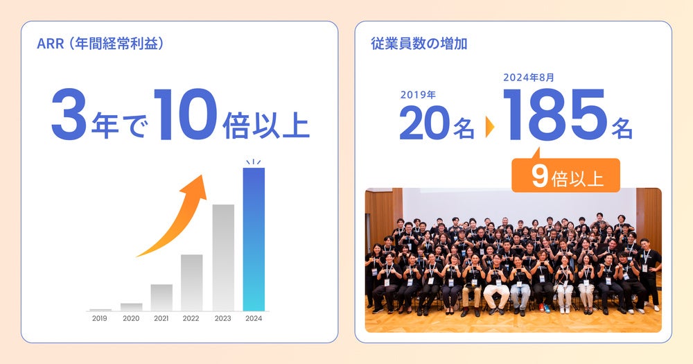 現在は全国30都道府県から、働き盛りの30代を中心に多くの優秀な人材が集まり、従業員数は185名となりました(2024年8月時点)。事業も順調に成長を続け、ARR(年間経常収益)は直近3年間で10倍以上と急拡大しています。