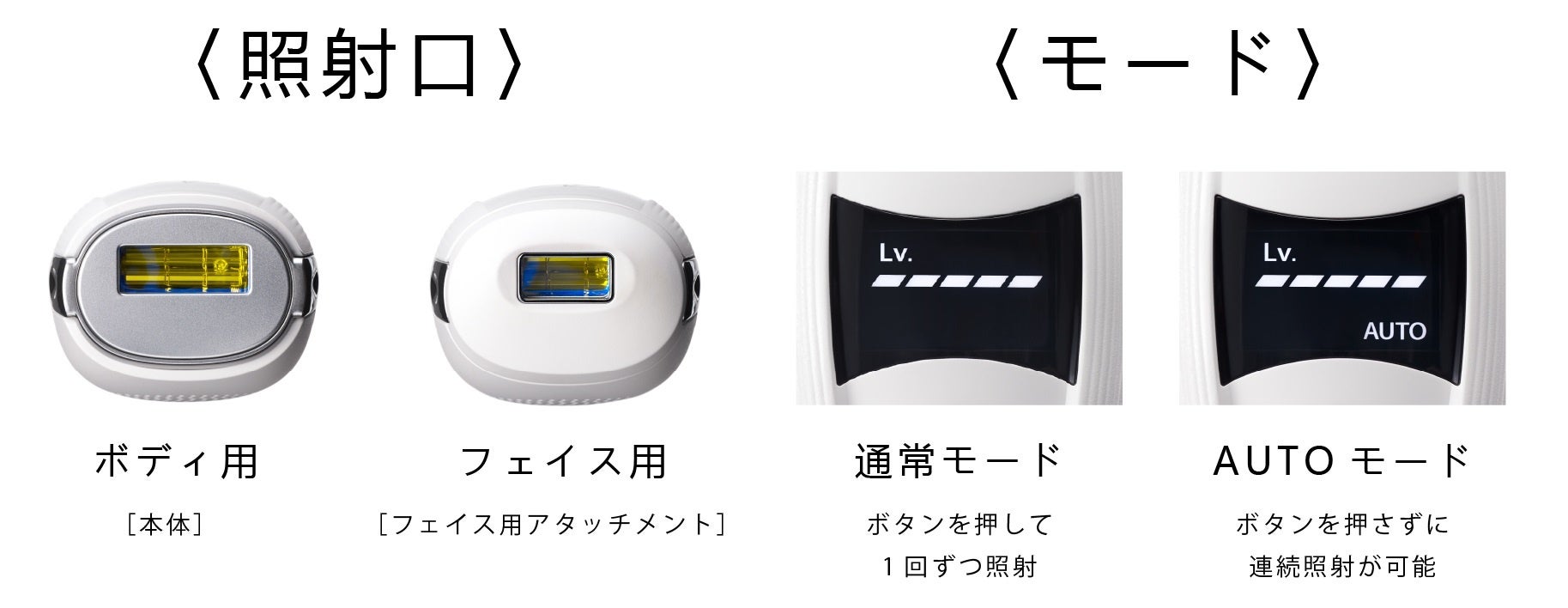 肌の面積や凹凸に合わせたケアができるよう、照射口とモードを2つずつご用意しました。肌の面積が広い腕や脚などは、AUTOモードで時短ケアを。