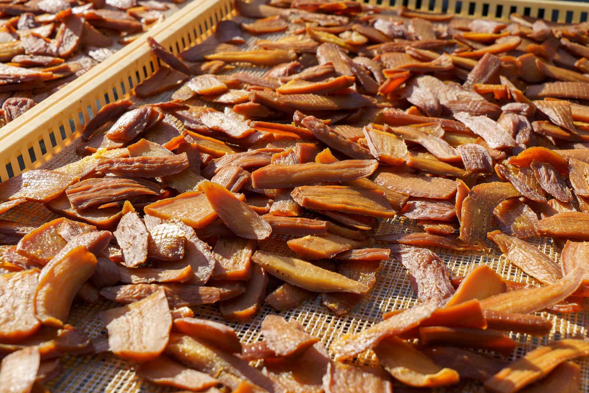 一般的な干し芋が薄い黄金色なのに対し、秦泉寺さんの干し芋は、深く黒みを帯びた飴色が特長です。