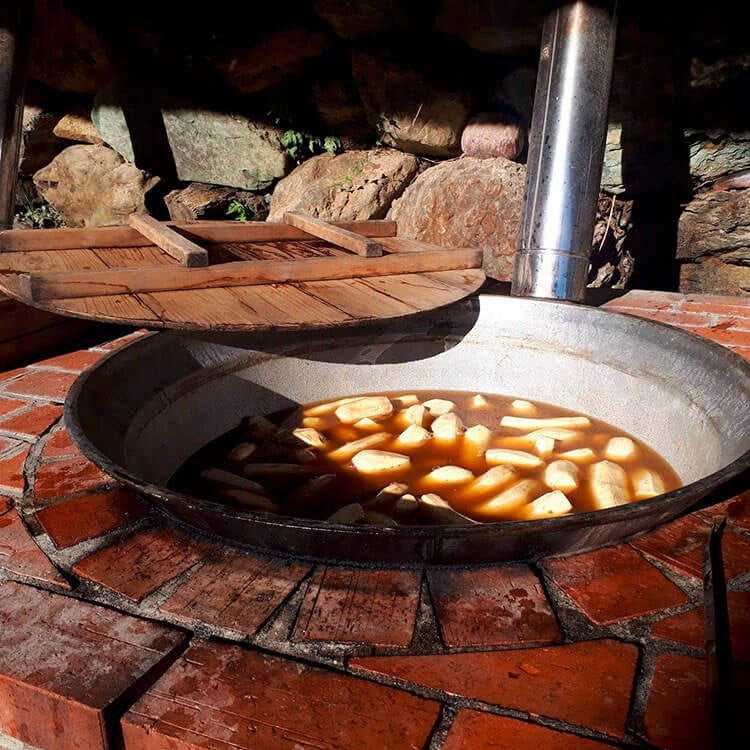 皮を剥いた芋は、大釜で一晩じっくりと煮込み、手切りしたのち天日干し。手間と時間を惜しまない、昔ながらの製法で丁寧につくられています。