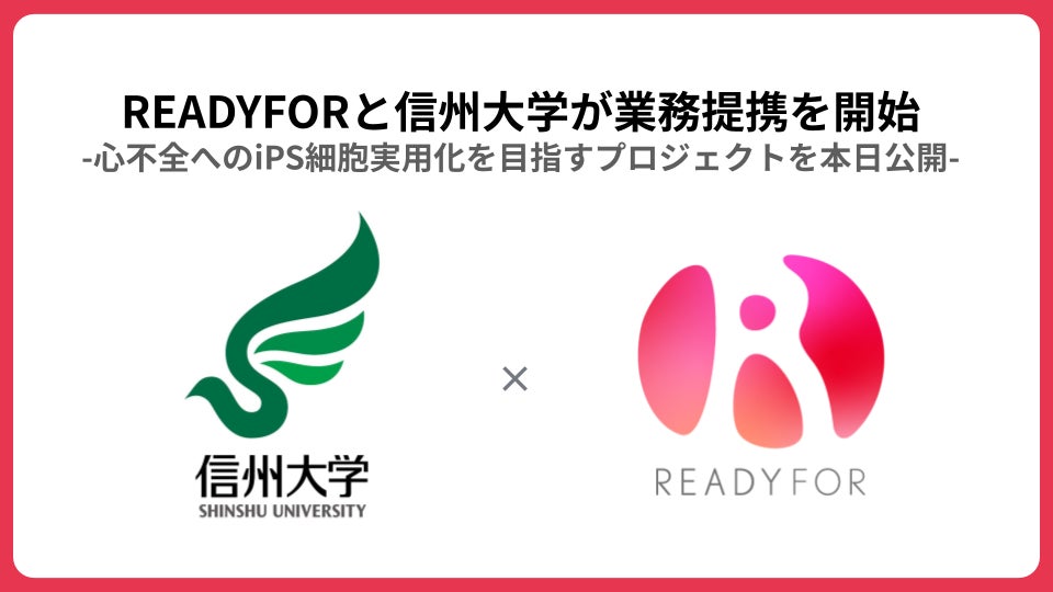 日本初・国内最大級のクラウドファンディングサービス「READYFOR」を運営するREADYFOR株式会社(本社:東京都千代田区、 代表:米良はるか)と国立大学法人信州大学(所在地:長野県松本市、学長:中村宗一郎)は業務提携を締結し、本日、第一号としてクラウドファンディングプロジェクト「心不全に対する心筋再生 iPS細胞実用化への課題解決を目指す研究へ」を公開いたしました。