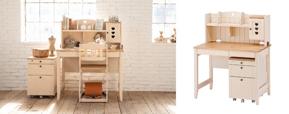 木目の見えるやわらかな印象のナチュラルホワイトが大好評の「Camomille(カモミール)」シリーズ。「ありのまま」の天然素材がつくる木目の豊かな表情を味わいながら、愛着を持ってお使いいただけます。ハートのアクセントは、お子様の夢がいっぱいに広がります。