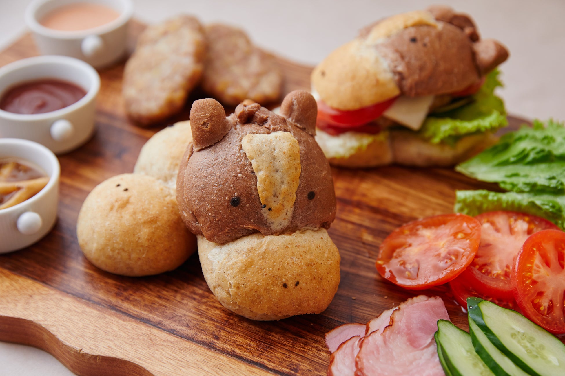 子どもたちは出発前にリゾナーレキッズスタジオで、家族で味わうランチ作りを体験します。作るのは馬をモチーフにしたかわいらしい見た目の「うまうまバーガー」です。馬をモチーフにしたバンズに、パティやベーコン、レタスなどの具材から好きなものを組み合わせ、家族のために思い思いの「うまうまバーガー」を作ります。付け合わせのソースやチップスと一緒に、ボックスに詰めたら完成です。