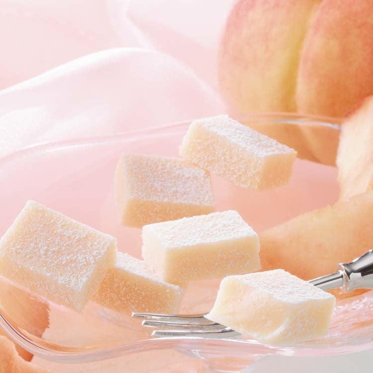 風味豊かな白桃の味わいが口いっぱいに広がる生チョコレート。国産白桃のパウダーとピューレをホワイトチョコレートに合わせ、風味付けに桃のリキュールをブレンドしました。白桃の味わいがホワイトチョコレートのまろやかな甘さととけ合います。