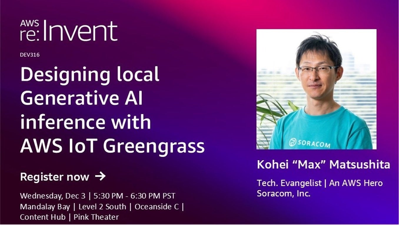 株式会社ソラコム(本社:東京都港区、代表取締役社長 CEO 玉川憲)は、2025年12月1日から5日まで、Amazon Web Services, Inc.(以下、AWS)が米ラスベガスで開催する「AWS re:Invent」に、テクノロジーエバンジェリストの松下 享平がセッションに登壇することをお知らせします。