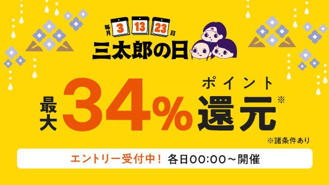 そのほか、三太郎の日の特典として、最大34%のポイント還元や最大5,000円割引クーポンの配布、50%以上割引クーポンのプレゼント、超目玉商品が購入できる限定セールを実施します。