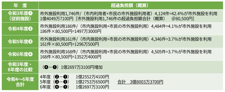 一方、奈良市民が市外施設を利用するケースは約10分の1となり、奈良市民の負担が軽減。市外施設利用による超過負担額は△1億3000万円と大幅に減少見込み。