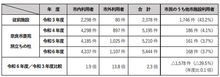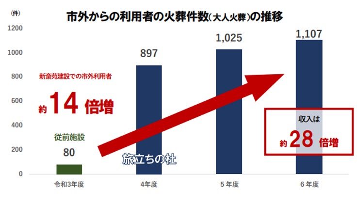 市内利用者数(大人火葬)が従前の施設(令和3年度)と比べると約2倍に増加。市外利用者数は約14倍に増加。使用料収入は6.4倍に増加。