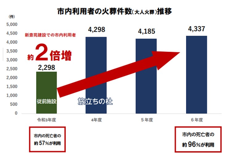 人体火葬のほとんど(約98%)を占める大人火葬では、市内利用者数が令和3年度(従前施設)2,298件から、令和6年度4,337件と約2倍に増加。
