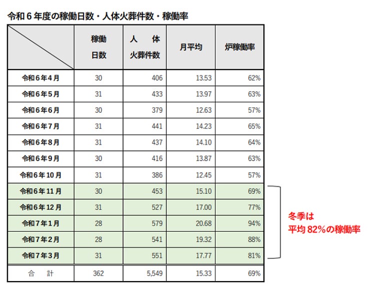 今年度の新たな取り組みとして、1炉あたり1日2回の火葬炉運用を3回に拡大。令和7年1月には火葬炉稼働率が94%と、冬季(11~3月の稼働率82%)の混雑に対応。火葬炉運用を増やし、安定的な供給を実現する。