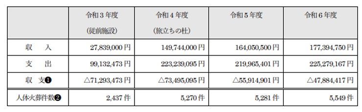 令和4年度以降、順調に増収となっており、令和3年度(従前施設)と令和6年度(新斎苑)の比較では、約1億5000万円の収入増となっています。一方で、支出は令和4年度では一時的に増加しましたが、令和5年度以降は着実に減少しています。