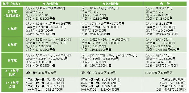 市民の経済的利益(歳入増+市外施設利用料の減少)は、令和6年度で約2億8000万円、4~6年度の3ヵ年合計で7億9000万円。