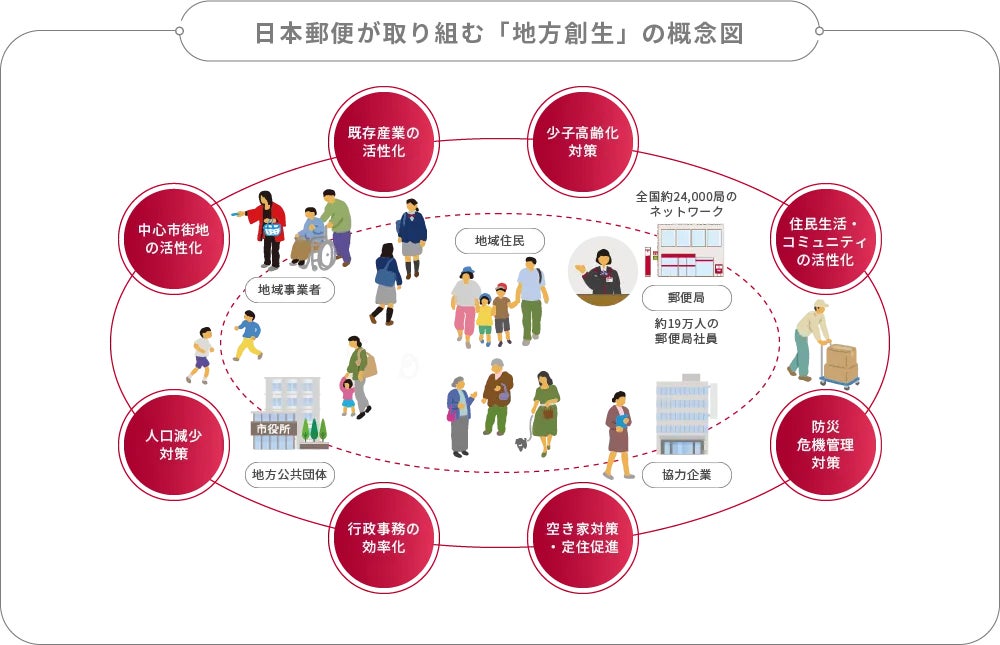 少子高齢化や地方の過疎化が急速に進む中、日本郵便は、全国各地域にある郵便局店舗(拠点・ネットワーク)や郵便局社員(マンパワー)を活用することで、高齢者や子育て世代への支援、健康寿命の向上、デジタルデバイドの解消等をはじめとした地域の社会・経済の活性化や課題の解決に貢献することを通じて、事業の持続的な成長につなげていきたいと考えています。