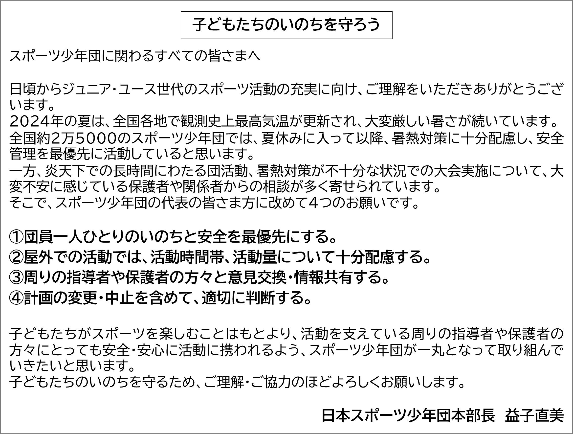 子どもたちのいのちを守ろう ~夏のスポーツ少年団活動の暑熱対策について日本スポーツ少年団益子本部長から4つのお願い~