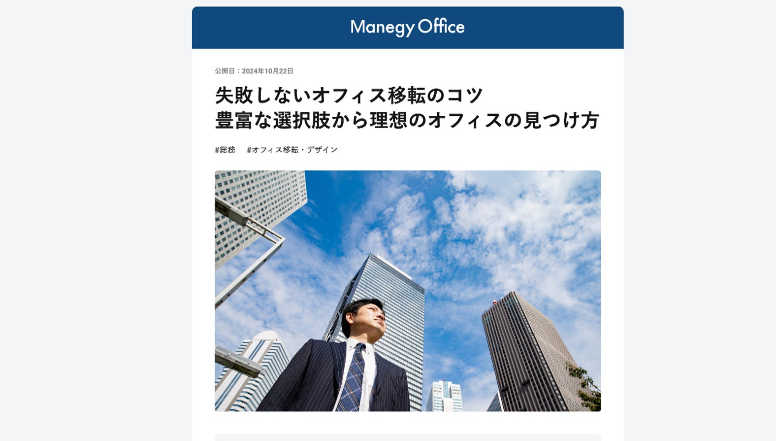 企業のオフィス移転や新規オフィス選定を検討する担当者を総合的にサポートする情報を提供するため、『Manegy Office』をリリースいたしました。