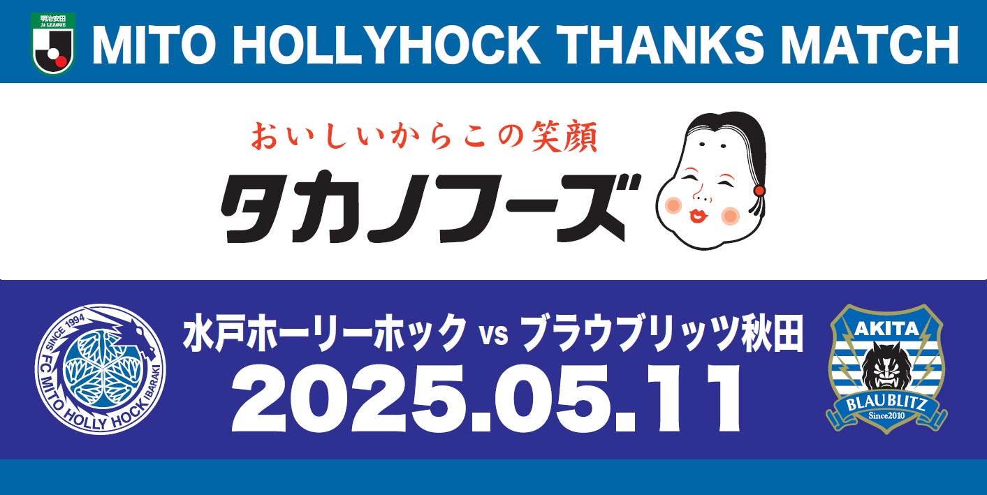 このたび、5月11日(日)に開催するホームゲーム、2025明治安田J2リーグ第15節 水戸ホーリーホック vs. ブラウブリッツ秋田をタカノフーズ株式会社にご支援いただき『タカノフーズサンクスマッチ』として開催いたします。