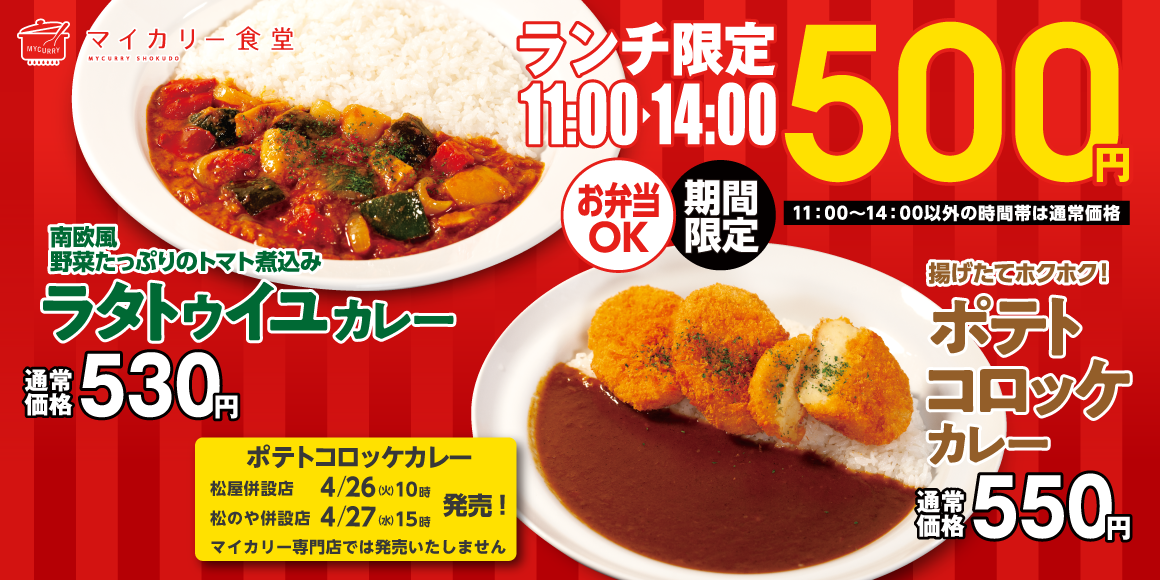 | 商品名 ポテトコロッケカレー 550円 ※お持ち帰りいただけます。 ※全て税込み価格です。また、店内・お持ち帰りの税込価格は同一です。 ※11時~14時は時間限定、500円で販売いたします。 発売日 【松屋併設店】4月26日(火)10時 【松のや併設店】4月27日(水)15時 対象店舗 一部店舗を除く全国のマイカリー食堂(松屋もしくは松のや併設店) ※マイカリー食堂三鷹店、マイカリー食堂板橋本町店、マイカリー食堂上野店、マイカリー食堂赤坂店、マイカリー食堂高田馬場店、マイカリー食堂練馬高野台店、マイカリー食堂水天宮店、マイカリー食堂豊田店での販売はいたしません。ご了承ください。 |