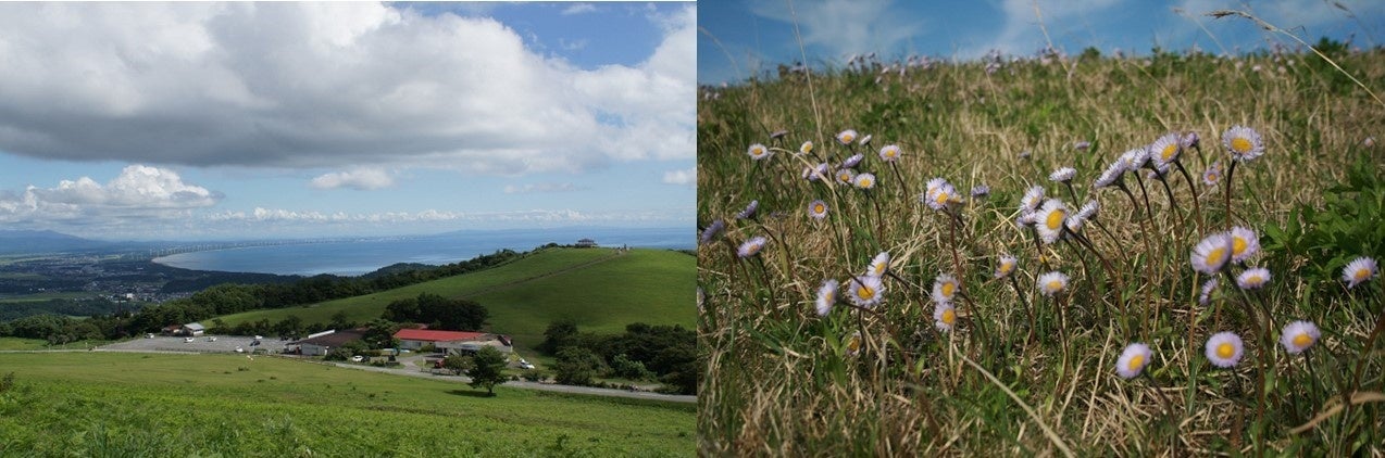 左:遮るものがないため、360度の景色を楽しめる寒風山山頂、右:寒風山に野生するアズマギク
