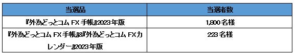 専用フォームに必要事項を入力のうえ、クイズに正解された方の中から抽選で2023名様に『外為どっとコムFX手帳』2023年版を進呈、さらに『外為どっとコムFX手帳』当選者の中から223名様に『外為どっとコムFXカレンダー』2023年版をプレゼントいたします。
