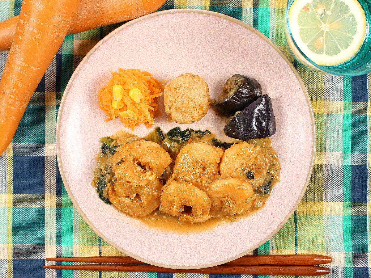 副菜は、人参サラダ、肉団子の甘酢あん、茄子麻婆です。えびとお肉が両方楽しめる満足感の高いプレートです。
