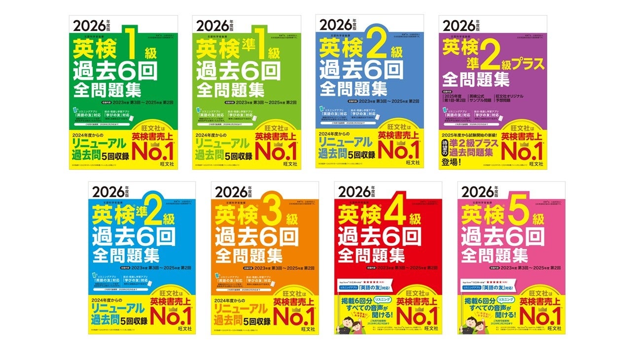 教育出版の株式会社旺文社(東京都新宿区/代表取締役社長 粂川 秀樹)は、「2026年度版 英検®過去6回全問題集」(1級・準1級・2級・準2級・3級・4級・5級)シリーズ、ならびに『2026年度版 英検®準2級プラス 全問題集』を2月26日(木)に刊行いたします。