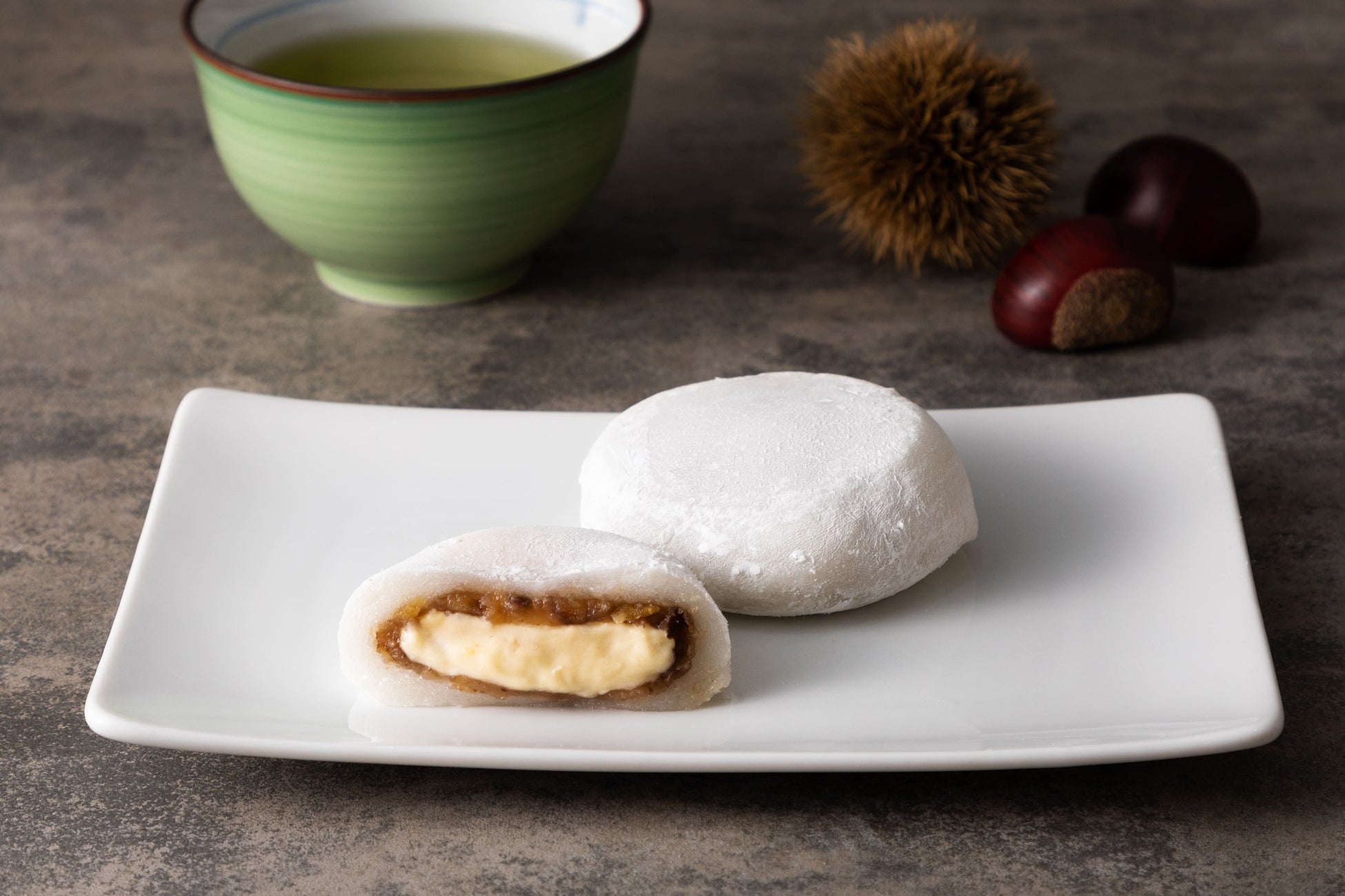 新商品「栗あんカスタード」は、優しい甘さのとろける求肥で栗あんと、なめらかなカスタードクリームを包みました。栗の風味、渋みを感じる粒入りの栗あんを使用することで上品な味わいに仕上げました。生地の柔らかさにマロンダイスの食感が加わり、味と食感をお楽しみいただけます。