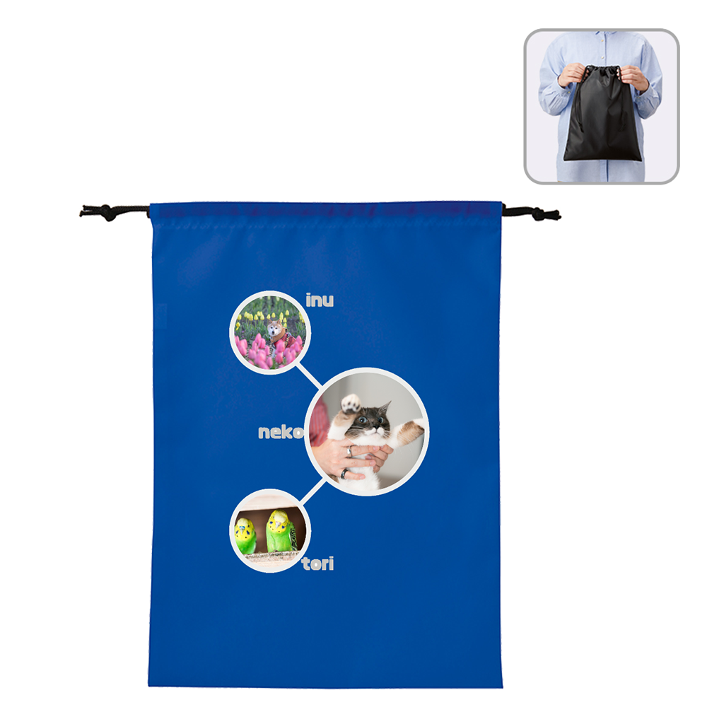 UP-Tから、A4サイズが入る大きめのポリ巾着が仲間入りしました。ポリエステル素材で汚れにくく、大きめサイズなので旅行のキャリーバッグを整理するのにもぴったりです。イベントの資料を入れて配布したり、ジム用バッグにしたりと様々な用途でお使いいただけるサイズ感です。