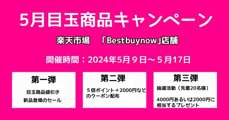 楽天市場は5月目玉商品大セールをきっかけに、本店舗「Bestbuynow&いまからようこそ」はセール活動を開催する予定です。