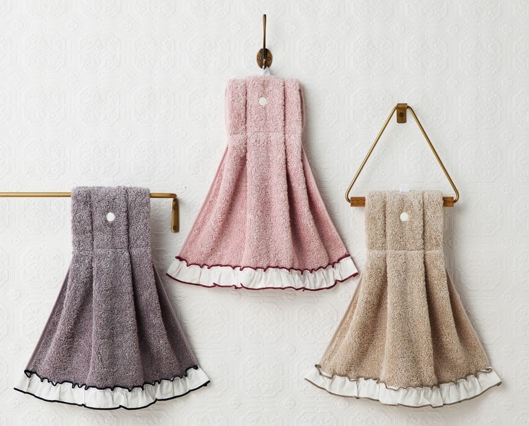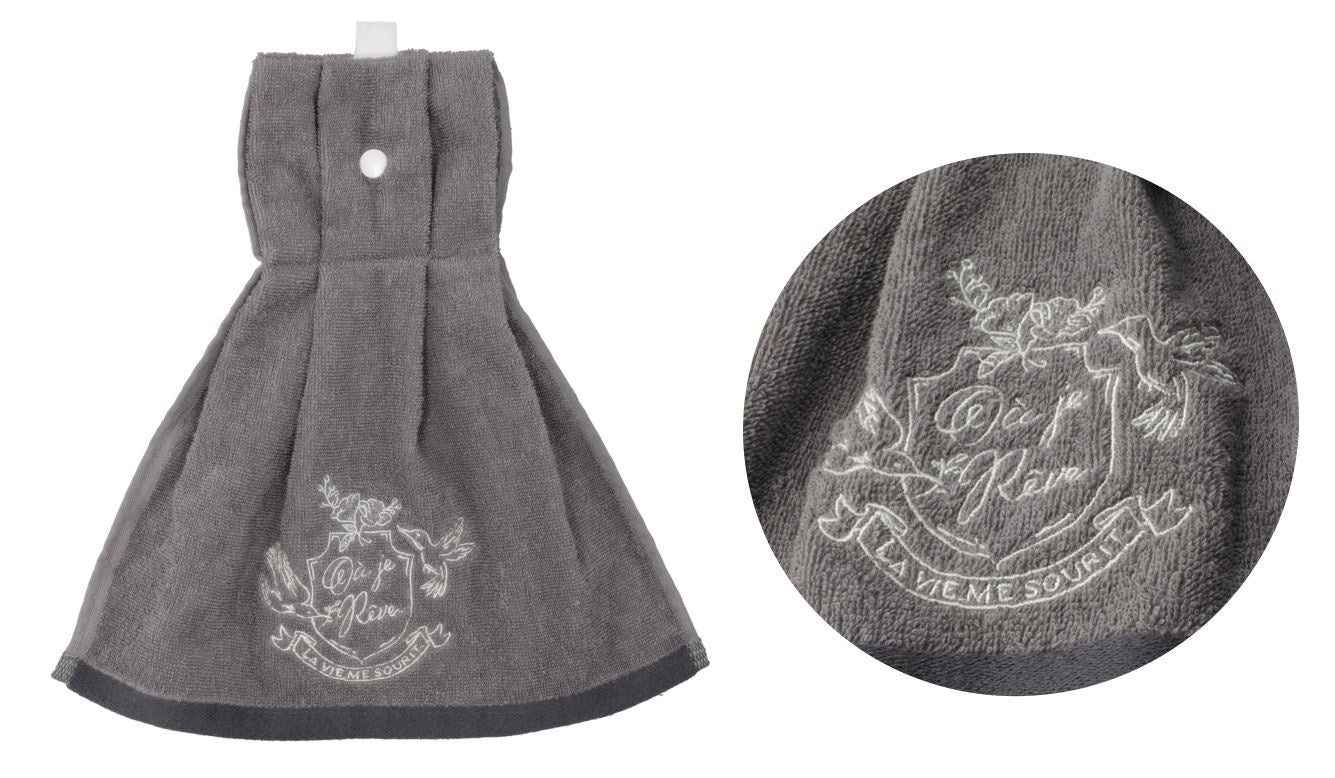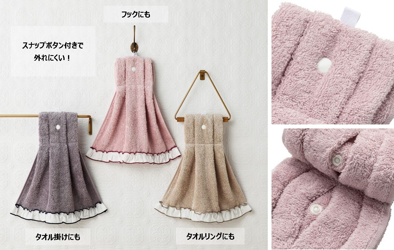 引掛け紐とスナップボタンがついているのでフック、タオル掛け、タオルリングなどに吊るせて便利。
