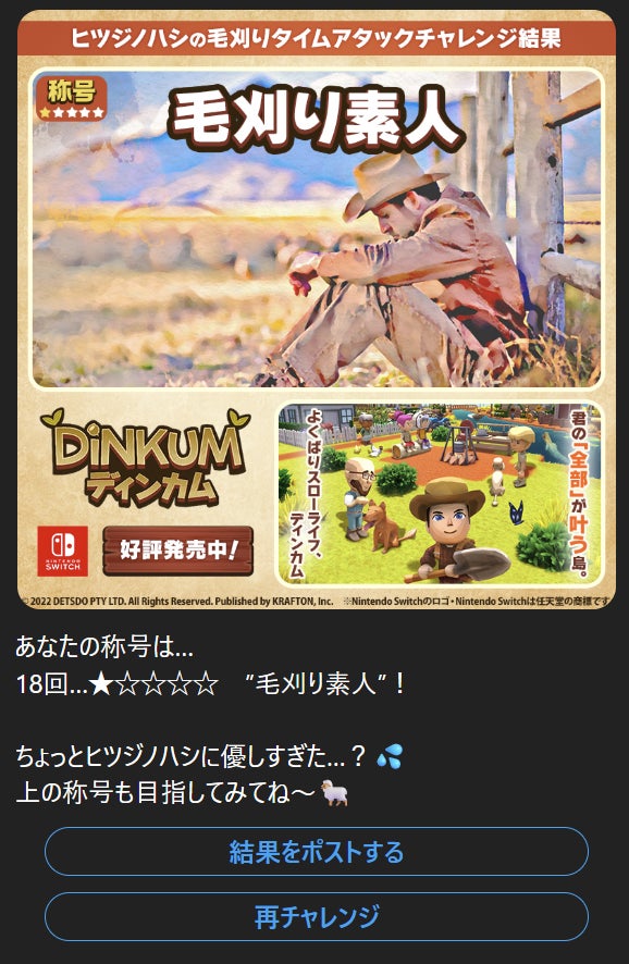 指定ハッシュタグを付けて、称号と共に結果をポストし、フォロワーに自慢しよう。
