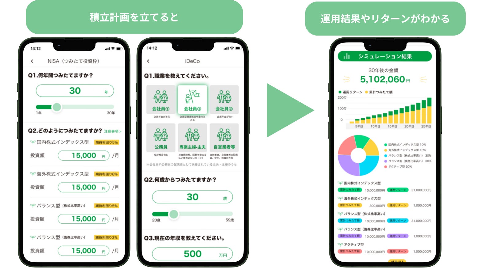 テキストで学習した内容を基に、アプリでNISAとiDeCoの積立シミュレーションを行うことで、実際の積立推移をイメージし、資産運用を始めるための一歩を無理なく踏み出せるようにサポートするコースとなっています。