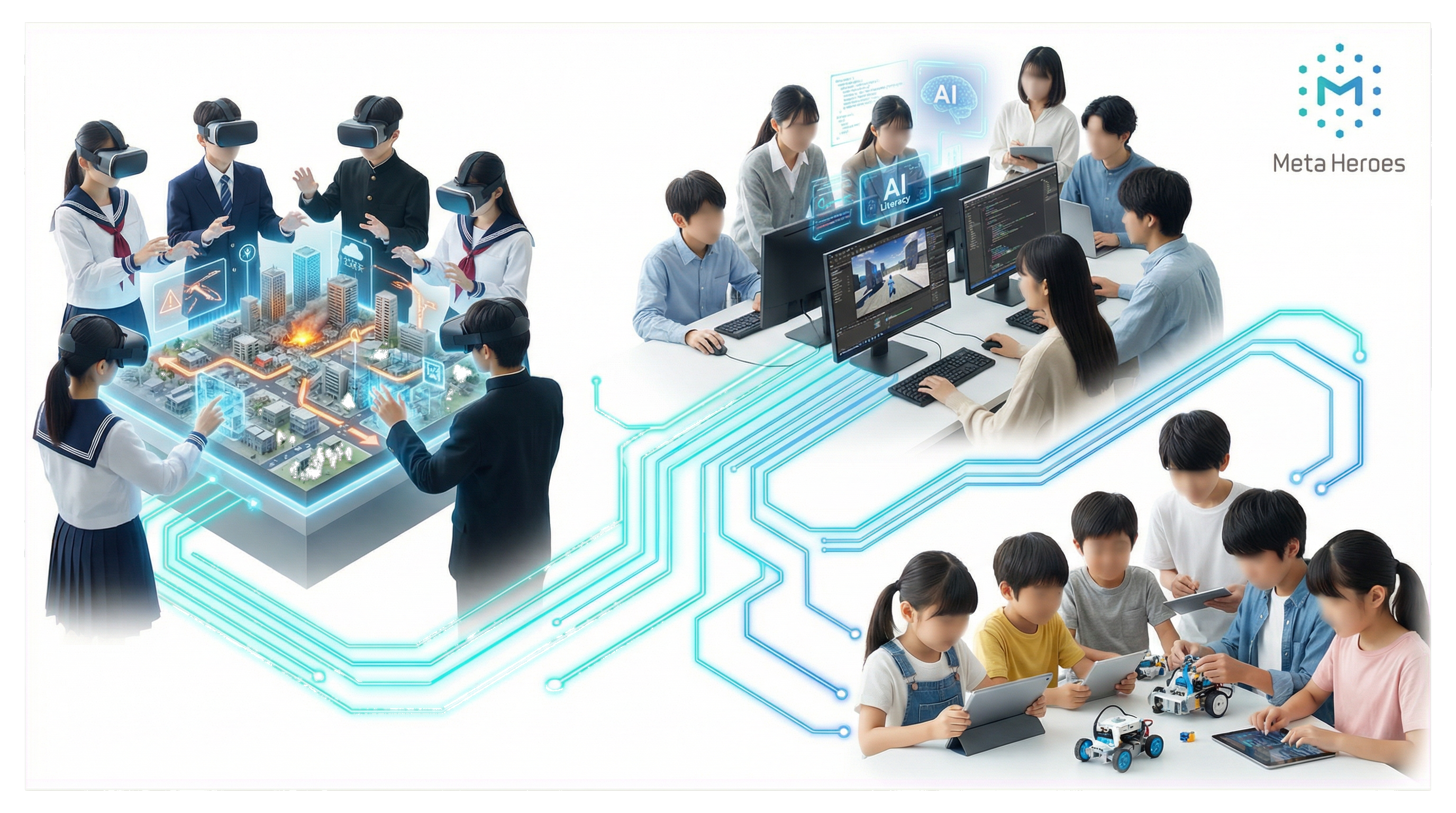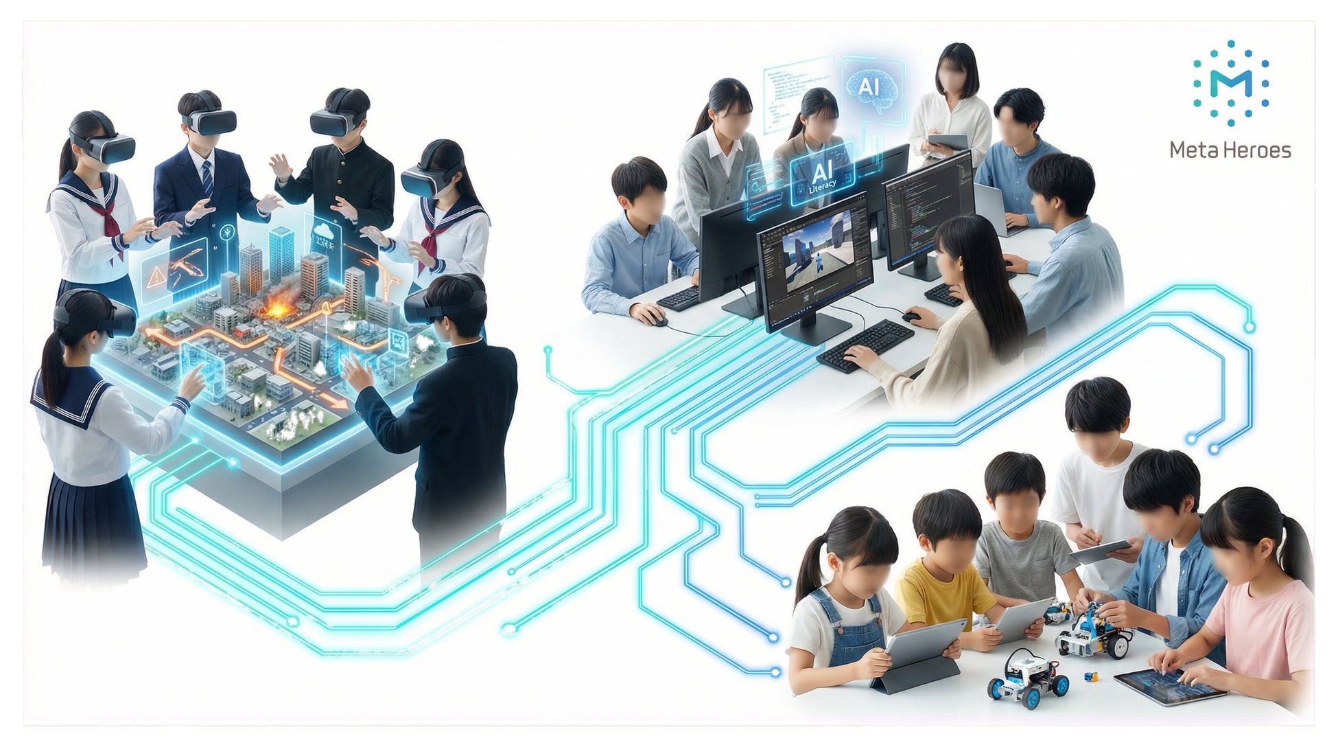 株式会社Meta Heroes(本社:大阪府大阪市、代表取締役:松石和俊、以下「当社」)は、教育領域における実践的な取り組みをさらに強化し、EdTechのリーディングカンパニーとしてのブランド確立を推進してまいります。当社はこれまで、メタバース(XR)、AI、ゲームクリエイティブを活用した教育プログラムを通じて、中学校、専門学校、大学、外国人留学生、小学生から高校生まで幅広い学習者に向けた次世代型教育を実践してきました。