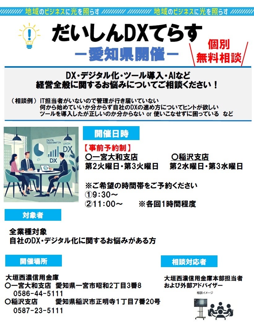 2025年11月より、大垣西濃信用金庫にて「DXてらす」と題した無料個別相談会を開始いたします。本相談会では、ITやDXに関するお悩みをお持ちの企業様を対象に、大垣西濃信用金庫本部担当者および外部アドバイザーとしてフォーバルの企業ドクターが個別に対応いたします。相談会は、一宮大和支店:11月11日(火)、稲沢支店:11月12日(水)より開始予定です。