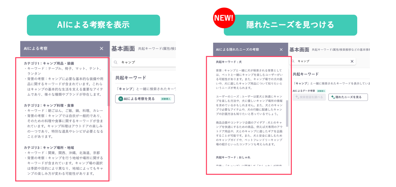 「キャンプ」についての分析結果の場合、既存の生成AIによる考察機能では人々の検索行動の意図として「キャンプ用品・装備」「キャンプ料理・食事」「キャンプ場所・地域」などといったカテゴリーに分類します。一方新機能は、ビッグデータから「犬」との関連性を見出し、ペットと一緒にキャンプを楽しみたいという「隠れたニーズ」を提案します。
