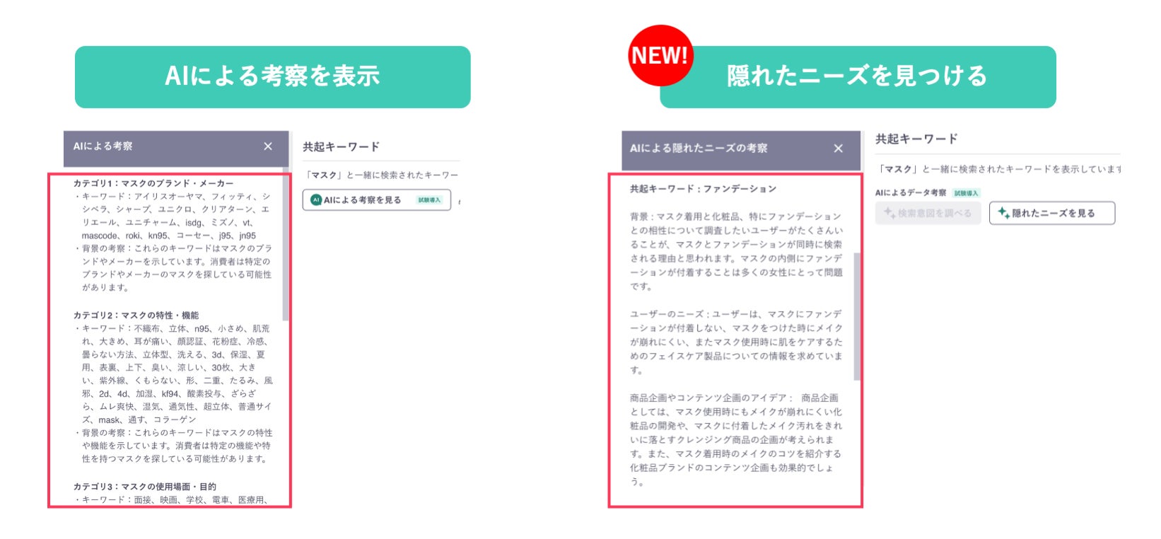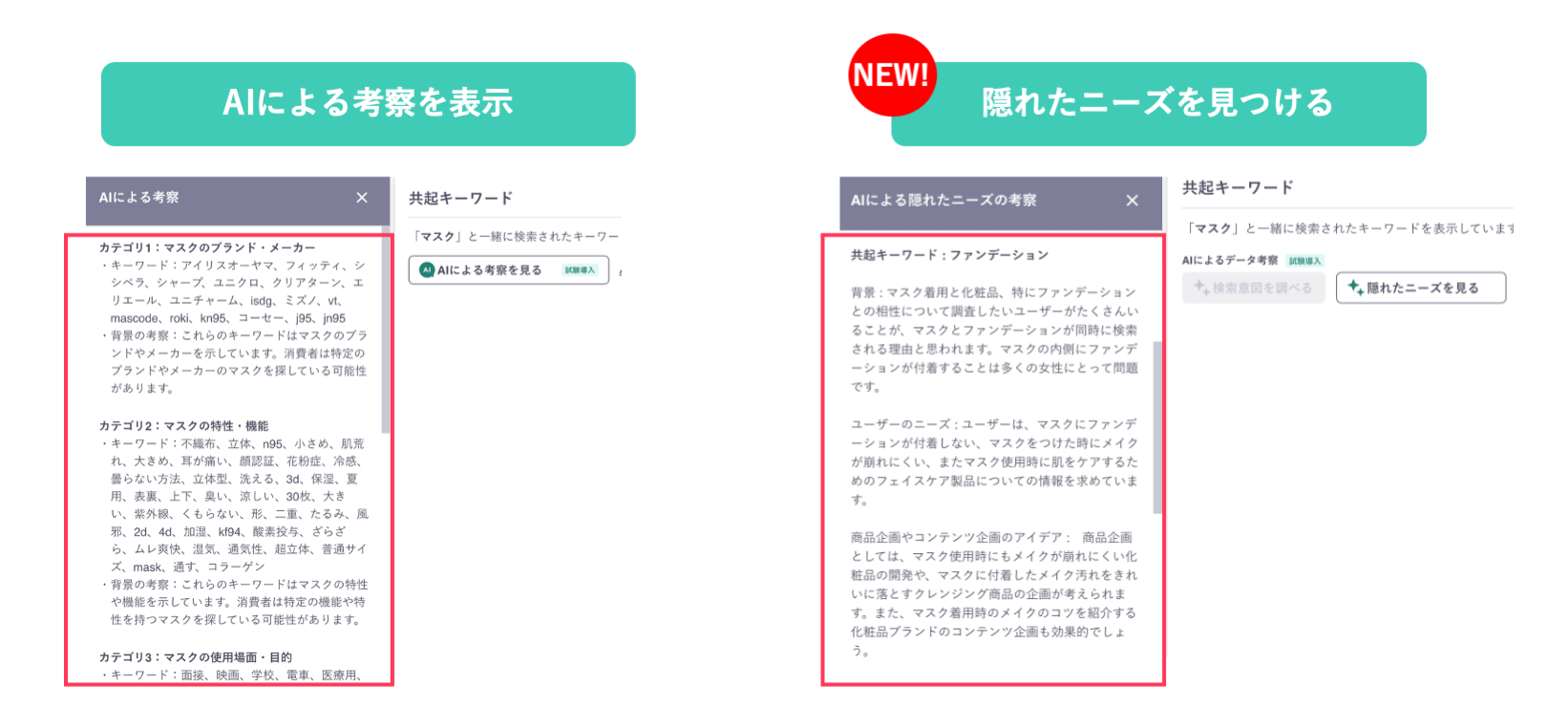 「マスク」についての分析結果の場合、既存の生成AIによる考察機能は人々の検索行動の意図として「マスクのブランド・メーカー」「マスクの特性・機能」などといったカテゴリーに分類します。一方新機能は、ビッグデータから「ファンデーション」との関連性を見出し、マスクに付着しづらいファンデーションを探す「隠れたニーズ」を提案します。