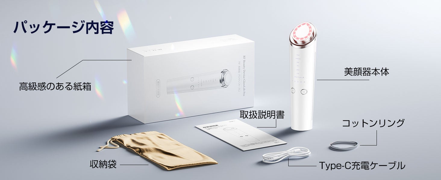 主な機能: EMS、マイクロカレント、RF(ラジオ波)、イオン導出・導入、超音波、冷却、LED光エステ(赤・緑・青)
